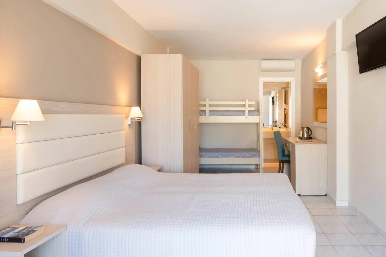 - Chambre vue mer (19 m²) : mêmes équipements. Capacité maximum : 3 adultes (lit d'appoint).
