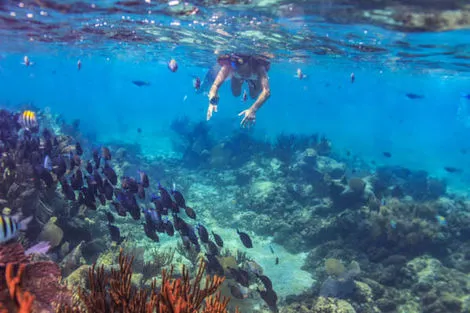 Découvrez les incroyables fonds marins de la mer Rouge. Départ pour deux sites de snorkeling (prêt de matériel). Arrêt sur l'île d'Orange. Orange Bay, située sur l'île de Giftun près d'Hurghada en Égypte, est une destination balnéaire prisée pour ses plages de sable blanc et ses eaux cristallines. Cet endroit paradisiaque offre des activités comme la plongée avec tuba, permettant aux visiteurs d'explorer les récifs coralliens et la vie marine exceptionnelle de la mer Rouge. Aménagée avec des pontons et des cabanes, Orange Bay est idéale pour se détendre et profiter du cadre tropical. C'est une escapade tranquille qui combine beauté naturelle et ambiance relaxante.